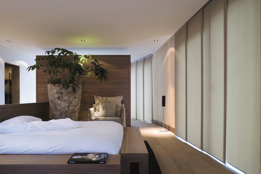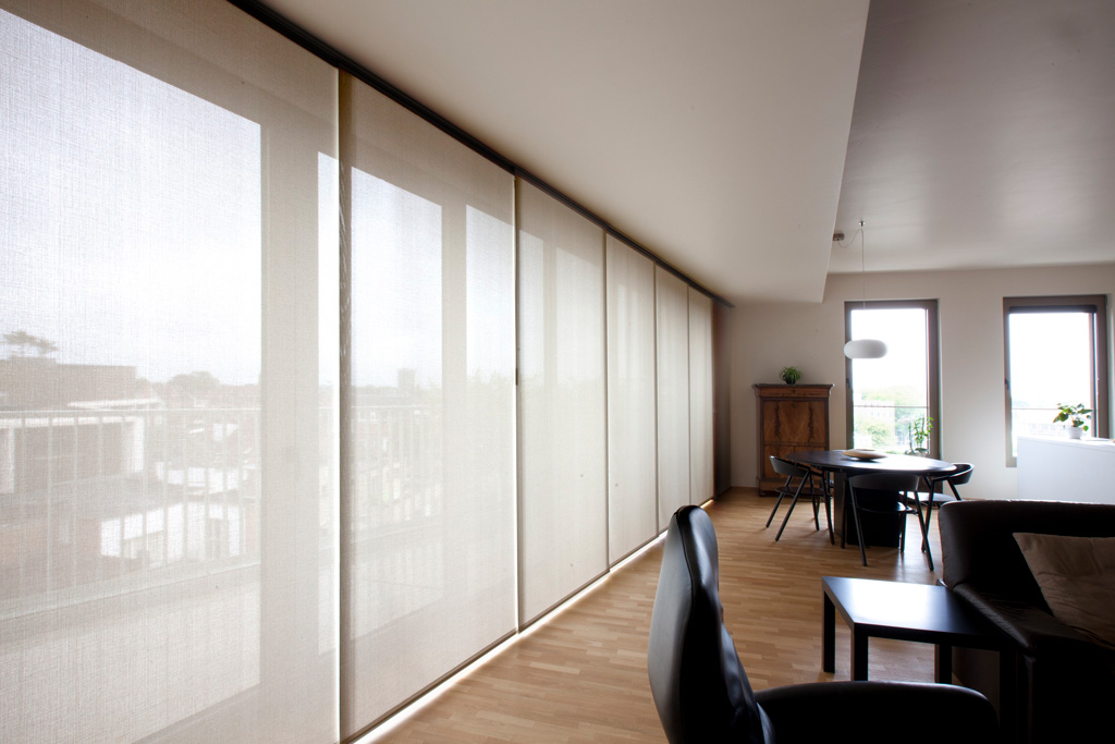 De brede verticale banen kunnen achter elkaar geschoven vormen, ideaal voor schuiframen en grote raampartijen. Doordat u de totale breedte opsplitst in verschillende delen, heeft de breedte van het raam geen invloed op het hanggedrag van het textiel.